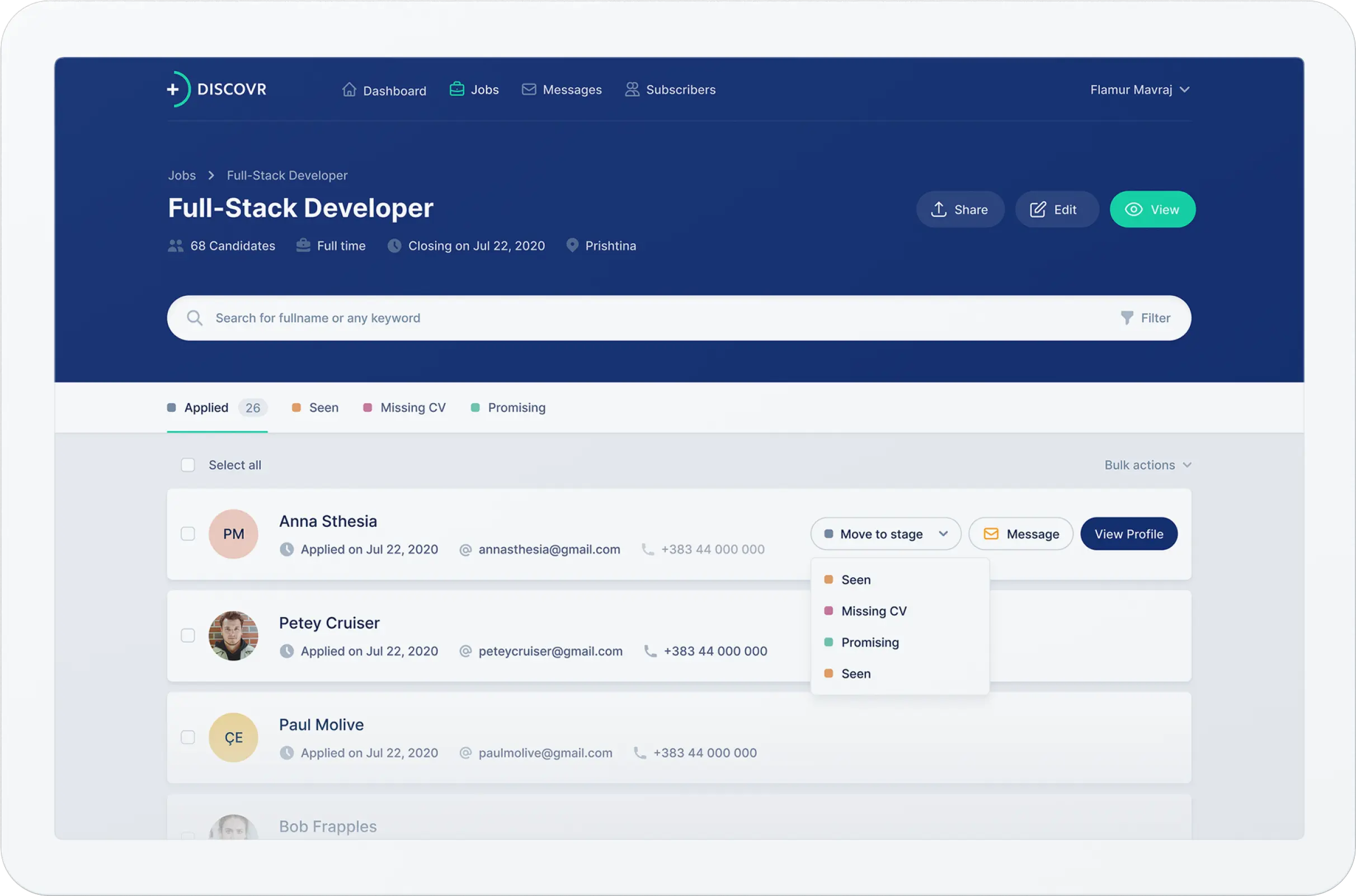 As an applicant tracking and recruiting platform, Discovr showcases all applicants who have applied for a job posting. By grouping all applicants in one location, employers gain a holistic view of their talent pool, enhancing their ability to make informed hiring decisions.
