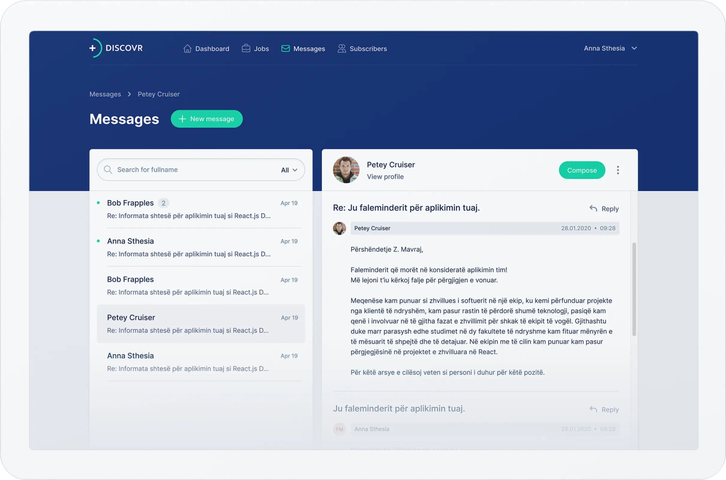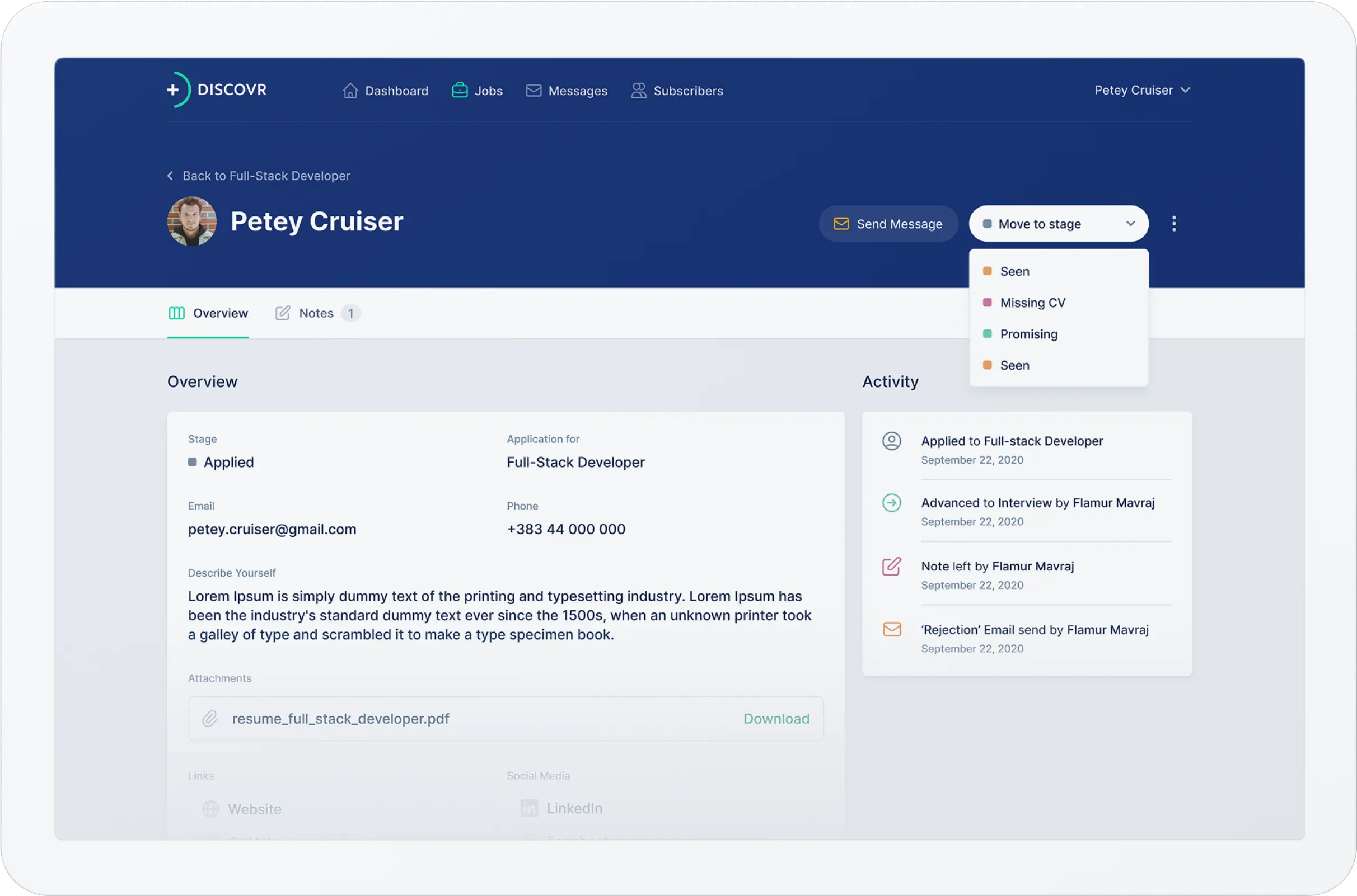Utilizing Discovr.plus, you have the ability to access an applicant's profile directly from the list of job applicants. This offers the added benefit of providing a comprehensive overview of the applicant's activity, including previous means of communication.